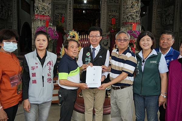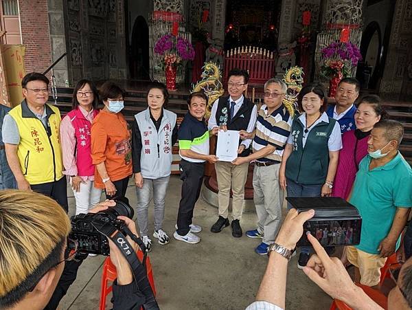 圖為反對在佳里都市計劃區內設置受水池!自救會長黃維明向立委郭國文呈遞陳情書。(記者 攝)