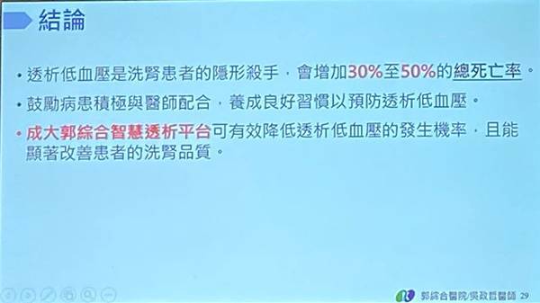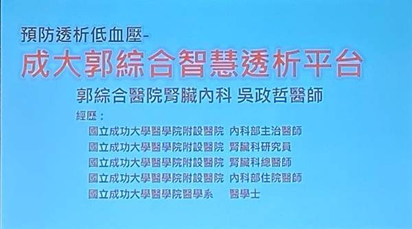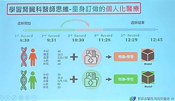 為了提升患者的治療效果和生活品質,郭綜合醫院與成大醫院合作開發智慧透析平台,通過AI演算法分析加上臨床實測做出最佳預測模型。每次透析時,智慧系統能夠分析病患病歷中的數據並結合當下的各項指標,預測未來的低血壓風險進而提前警示,讓醫護人員能夠及時調整治療計劃並採取適當的預防措施。由於每位患者的共病症及身體狀況皆不相同,所需要的透析處方也都不同,智慧透析系統能夠根據病患的體質和病情進行個人化的風險評估,期望能達到個人化的精準醫療。