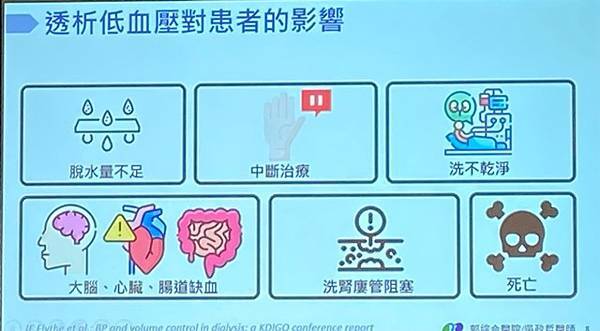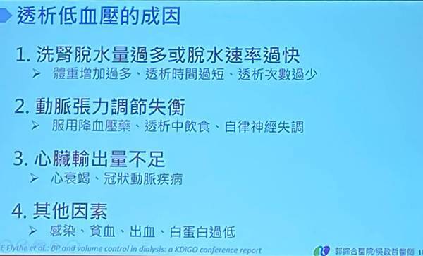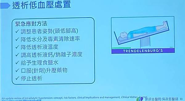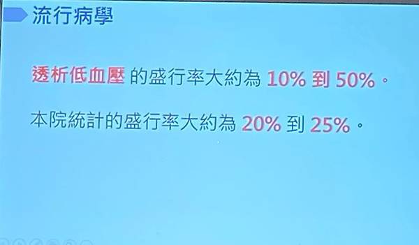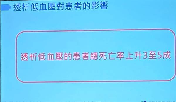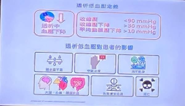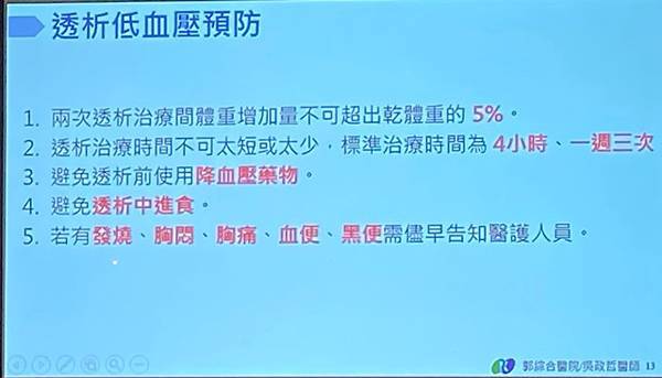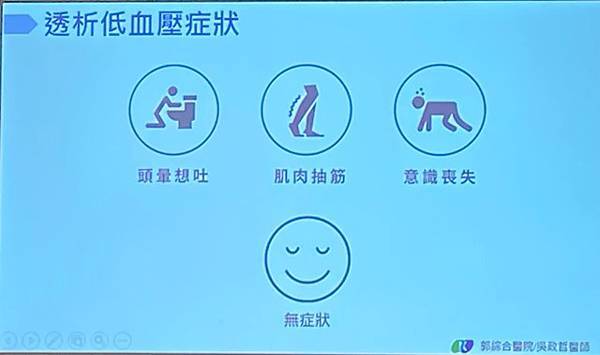 首先,我們鼓勵病患積極配合預防透析低血壓,包括: 1.兩次透析治療間體重增加應少於乾體重的5%、2.透析時間不可太短、3.避免透析前使用降血壓藥物、4.避免透析中進食、5.若有發燒、胸痛、血便或任何不舒服需儘早告知醫護人員。