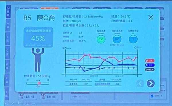 案例一: 89歲的蕭先生,因糖尿病腎病變已洗腎1年,最近半年在洗腎當中經常出現低血壓、抽筋、甚至頭暈嘔吐的情況。智慧透析平台上線之後,透過AI的快速風險預測和警示,醫療團隊能快速調整血液透析機參數,發生透析低血壓的次數有明顯的下降,病人也覺得洗腎時舒服多了。