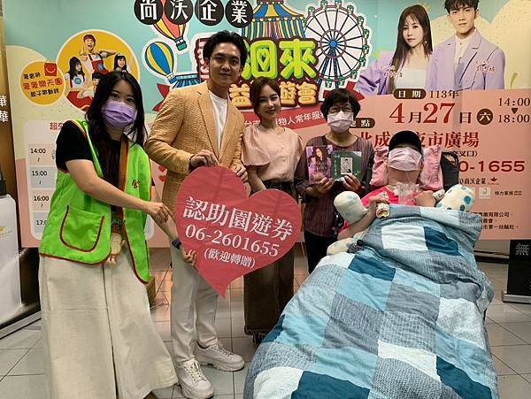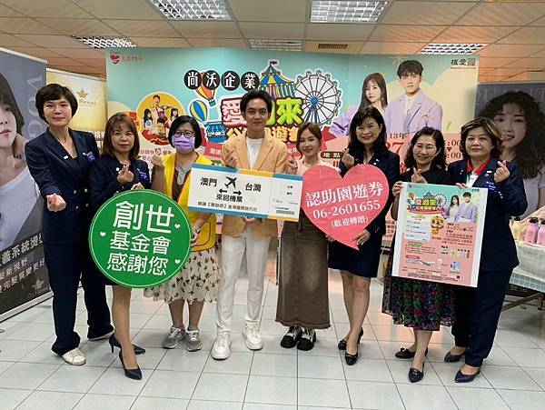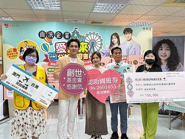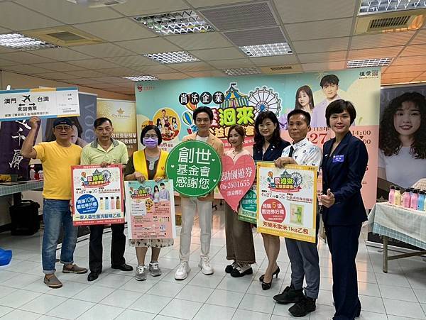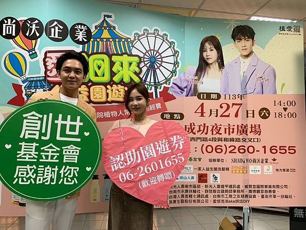 歌手郭忠祐說:「跟創世的緣分起於一次的節目錄影,他們很拚命的樣子讓我印象深刻,今天很開心又有機會一起做公益。」杜忻恬也說:「園遊會活動當天我跟忠祐也會到現場表演,希望喜歡我們的粉絲們可以一起來走走,吃喝玩樂之餘又可以做公益。」尚沃企業劉明飛經理慷慨捐助10萬元幫助創世安養服務,南山人壽鳳凰通訊處郭君萍處經理帶頭響應愛心設攤,帶領通訊處同仁一起為植物人獻愛。公益園遊會除由歌手杜忻恬、郭忠祐擔任愛心大使帶來精采演出外,現場還有由金海國際旅行社提供的澳門來回機票、品諾電風扇、杰威通路隨身氣泡水機等摸彩獎品。台南華一扶輪社除了園遊會當天設攤義賣外,記者會當天謝馨慧社長還加碼捐助8萬8千元,希望能拋磚引玉,邀請更多人一起加入。