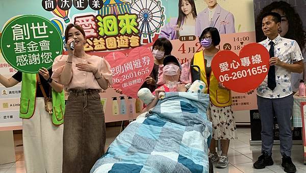 創世基金會台南院每年都會舉辦公益園遊會,除因疫情考量曾暫停2年,每年都有將近80至100攤的愛心單位參與,是安養院募集服務經費的重要來源之一。今年(2024)也選在4月27日(六)下午2點舉辦「愛洄來.公益園遊會」,義賣所得全數捐助創世基金會。植物人院民小玉(化名)媽媽表示,小玉本來就很喜歡唱歌,臥床以後雖然不能再唱歌了,但在郭忠祐、杜忻恬歌聲的陪伴下,也讓小玉感受熱鬧氛圍。