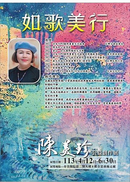 【柿子日報記者李玲/台南報導】陳美珍藝術家受邀奇美醫院、奇恩藝廊展出,「如歌美行」為癌症病患及家屬,醫護團隊們,帶來撫慰的溫暖,展出時間自113年4月12日至6月30日,假奇美醫院第二醫大樓8樓奇恩藝術走廊展出。