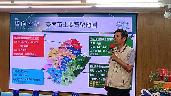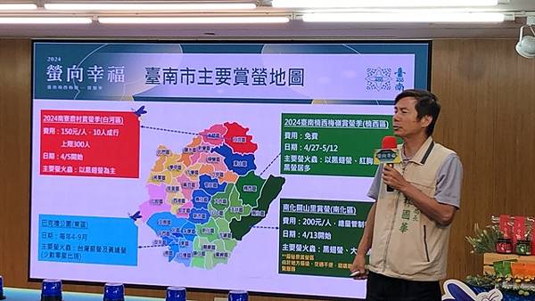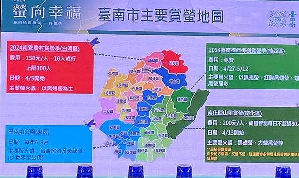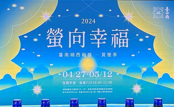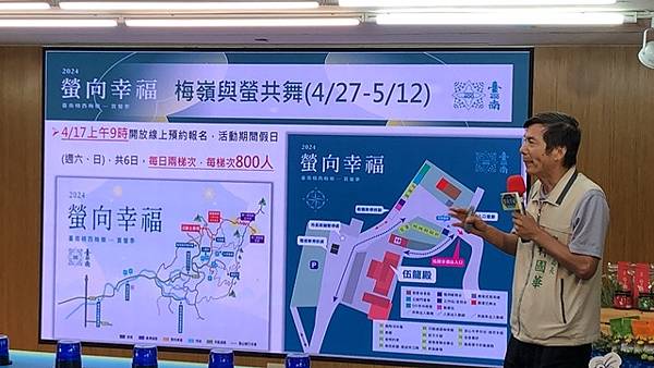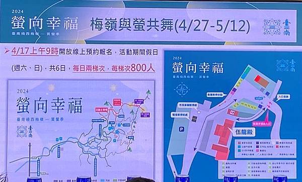 觀光旅遊局長林國華指出,賞螢季今已邁入第19年,楠西梅嶺賞螢季於4月27日(六)開跑,臺南其他賞螢區,如白河南寮(2024南寮農村賞螢季,4月5日起開跑)、南化關山(4月13日開始)等由民間自辦的付費賞螢活動也陸續展開,均採預約報名及總量管制方式。臺南市區巴克禮公園每年4-9月期間也可見零星螢火蟲(主要為台灣窗螢及黃緣螢),至於新化林場因溼地外圍清淤工程進行中,為降低人為因素擾動,今年暫停辦理。「2024臺南楠西梅嶺賞螢季」活動於4月27日起至5月12日幸福登場,平日不須報名即可自行入山賞螢,為期三週假日(六、日)採線上預約登記報名,每日2梯次,分別為下午4點到5點、下午5點半到6點半,以每梯次800人,每日共計1,600人。此外,活動期間假日的梅子酒手作體驗,每日2梯次,每梯次20人,每人250元。兩項報名活動,同步於4月17日上午9時開放線上報名。