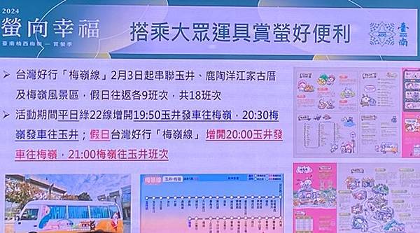 搭乘大眾運輸的民眾,可搭乘大台南公車<綠幹線>,由臺南至玉井,再轉乘平日<綠22線>或假日<台灣好行-梅嶺線>前往楠西、梅嶺。活動期間平日<綠22線>增開19:50玉井往梅嶺班次,20:30梅嶺往玉井班次,而假日(4/27-28、5/4-5、5/11-12)<台灣好行-梅嶺線>增開20:00玉井往梅嶺班次,21:00梅嶺往玉井班次。請搭乘民眾務必注意班次時間,詳細站點及票價資訊,請上興南客運http://www.snbus.com.tw/或大台南公車https://2384.tainan.gov.tw/查詢。
