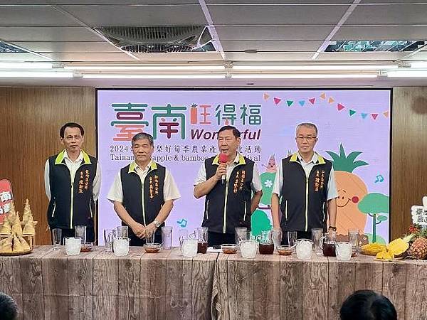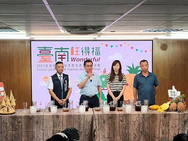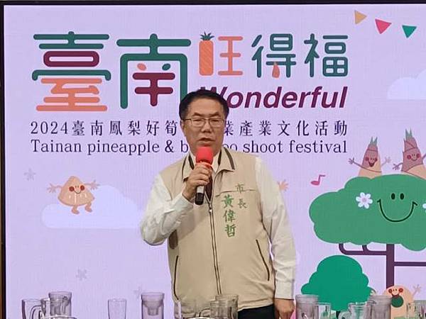 【柿子日報記者李玲/台南報導】臺南鳳梨、綠竹筍進入採收季節,「2024臺南鳳梨好筍季」將於本週展開,關廟、龍崎、新化、山上等四大產區今(17)日於永華市政中心召開行銷推廣記者會,臺南市長黃偉哲親臨主持,大力推薦「臺南的水果就是讚!」。黃偉哲表示臺南鳯梨及綠竹筍品質優良,遠近馳名。