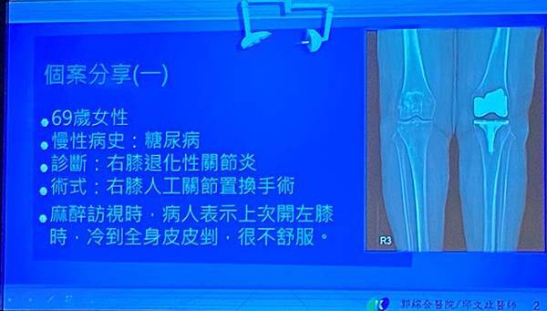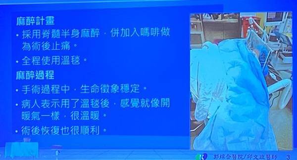 【柿子日報記者李玲/台南報導】69歲阿嬤,有慢性糖尿病史。這次因右膝退化性關節炎,接受右膝人工關節置換手術。術前麻醉訪視的過程中,阿嬤說:上次開左腳齁,開刀房有夠冷ㄟ,冷到全身皮皮剉。跟阿嬤解釋跟討論後,預計採用半身脊髓麻醉,自費使用熱空氣式溫毯。手術過程中,阿嬤表示很溫暖,就像寒流時開暖氣一樣,術後恢復也很順利。