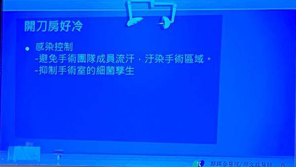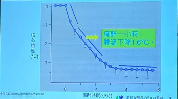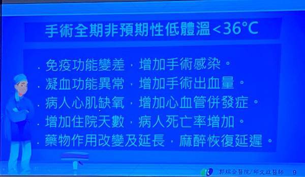 手術室的溫度一般都設在攝氏18到24度,主要是為了手術團隊的舒適度及感染控制。病人在接受麻醉後,周邊血管會擴張,增加體溫的散失。因為血液循環的緣故,四肢溫度低的血液回流到心臟,核心溫度高的血液運送到四肢,造成體溫重新分布。手術病人在全身麻醉下,如果沒有適當的保暖,在一小時後,核心體溫會下降1.6度(如圖)。一旦體溫下降到36度以下,就會發生手術全期非預期性低體溫。手術全期非預期性低體溫會對手術造成一些不良影響,如:免疫功能變差,增加手術感染。凝血功能異常,增加手術出血量。病人心肌缺氧,增加心血管併發症。增加住院天數,病人死亡率增加。藥物作用改變及延長,麻醉恢復延遲。