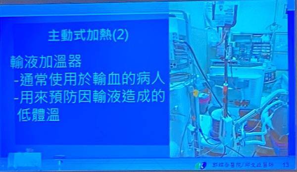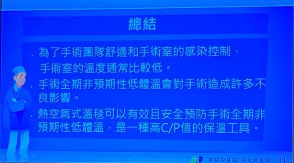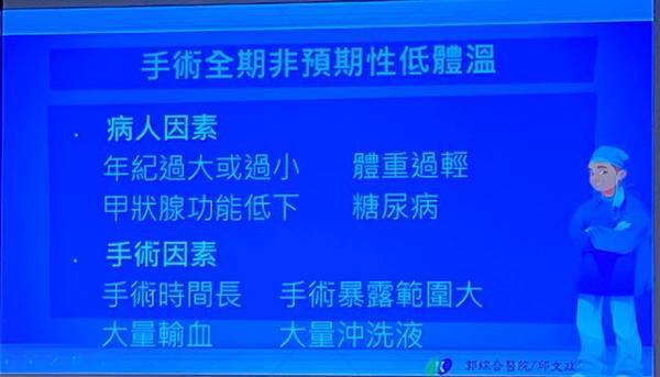 術後加速康復(ERAS)的導引中,維持正常的體溫被視為必要條件之一。麻醉醫師會在術前麻醉訪視中,根據病人本身的條件和手術的類型,和病人討論適當的麻醉計畫和保溫方式。在手術全期中積極保溫,預防手術全期非預期性低體溫的發生,提升麻醉安全,降低手術併發症。