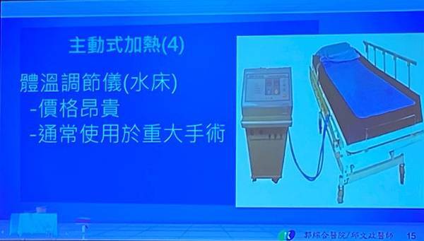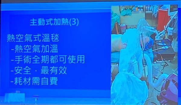 烤燈是由輻射導熱,有灼傷的風險,手術進行的過程中,也不方便使用。輸液加熱器是直接對輸液的管路加熱,讓溫暖的輸液進入人體,主要是使用在需要輸血的病人。熱空氣式溫毯是利用溫毯上微小的氣孔,將熱空氣平均運送到溫毯的覆蓋範圍,不容易發生熱傷害。體溫調節儀是指在手術床上鋪上一層可加溫的水床,價格比較昂貴。目前熱空氣式溫毯是公認安全且有效的保溫工具。