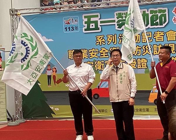 【柿子日報記者李玲/台南報導】迎接即將到來的五一勞動節,台南市政府今(29)日在永華市政中心辦理113年「幸福五月天 快樂勞動讚」系列活動記者會,台南市長黃偉哲親自主持,除頒發感謝狀予配合活動的單位代表,也授旗予今年新成立的安衛家族「大亞電線電纜股份有限公司」及「新舜營造有限公司」,隨後針對今年度職業安全衛生防災訪視輔導員進行授證,感謝大家的努力與支持。
