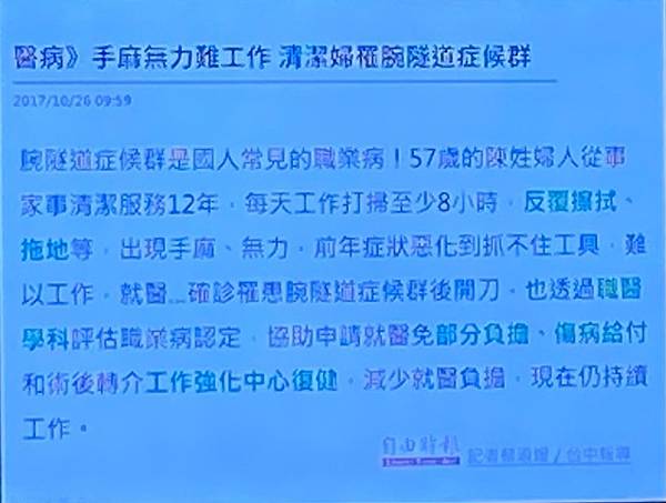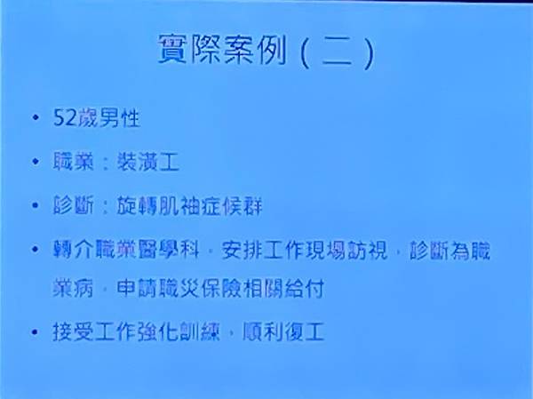 另一位是52歲的蔡先生,職業為裝潢工人,工作中雙手常需抬舉過肩釘天花板,最近因抬舉困難,就醫被診斷罹患「旋轉肌袖症候群」,轉介至職業醫學科。職醫科醫師進行現場訪視後,認定為職業病。蔡先生在成大醫院團隊協助下,申請職災保險醫療給付及傷病給付,也在醫院接受工作強化訓練,最後順利恢復原工作。