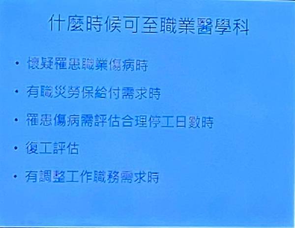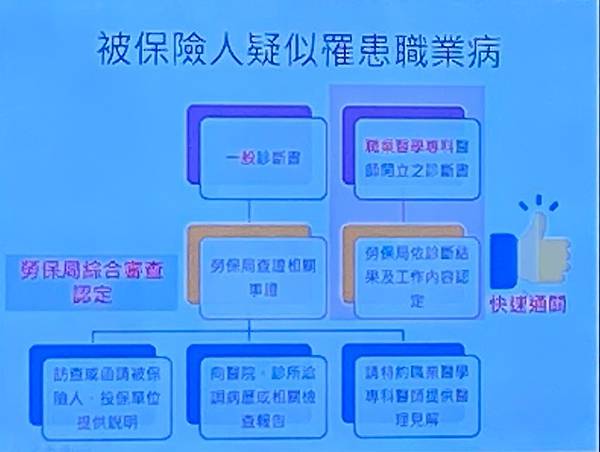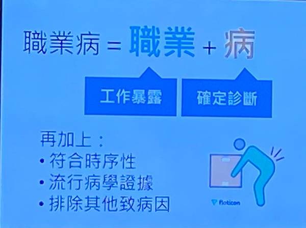 成大醫院職業及環境醫學部何勻瑋醫師表示,職業病成立的要件,包括:確定疾病診斷、工作暴露、符合時序性、有流行病學證據支持,再合理排除其他致病因。職業醫學科醫師會依據診斷,詳細瞭解工作中可能的危害,必要時也安排工作現場訪視,收集危害暴露資料,再送勞保局申請認定。若勞保局函請補充資料,職業醫學科醫師會協助釐清狀況,免除勞工朋友親自填寫危害暴露調查或補充說明的困擾。