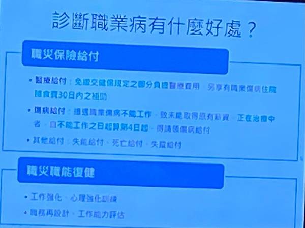 何勻瑋醫師說明,勞工若確定診斷為職業病,可透過職業災害保險免繳部分負擔醫療費用,另享有住院膳食費補助;勞工罹患職業傷病,若因治療而不能工作、無法取得原有薪資,從不能工作的第4天開始,可以請領傷病給付,作為薪資補償。