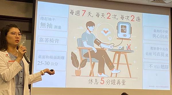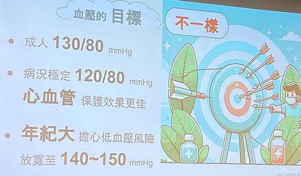 台南新樓醫院腎臟內科王婷翊醫師提及,血壓控制的目標會根據每個人的狀況,有些微不同,以慢性腎臟病的病人為例,建議目標血壓為 130/80 mmHg 以下,若穩定病況可考慮更嚴格的標準:120/80 mmHg 以下,對心血管保護效果更佳。然而,對於年長、虛弱、末期病患者,因擔憂低血壓造成的風險,可放寬至140~150 mmHg 以下。血壓量測技巧『722法則』連續7天測量,每天早晚各一次,每次量測兩遍,心律不整病人,兩次量測值落差太大,可以量測三遍以上,選取兩個接近的數值做平均。量測血壓的標準動作,在測量前避免茶類、咖啡因或劇烈運動,保持正確坐姿,手臂放於心臟高度,並在安靜環境下量測。