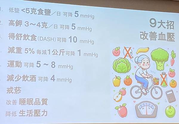 1. 低鹽飲食:日攝鹽量不超過5克,增加高鉀食物攝取。