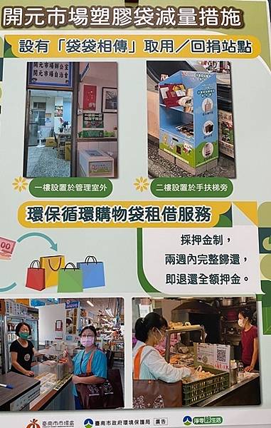 市府為持續推動市場減塑,今年擴大推廣到開元市場,除貼心提供循環購物袋租借服務,5月到11月期間,推出「環保新時『袋』」抽獎活動,只要持自備或租借的購物袋到該市場實質消費,且不額外索取塑膠袋,並至開元市場自治會長攤位(2030號)掃描QR-Code填妥資料並上傳與購物袋之合照,即可獲得抽獎機會(每人每日限填寫一次),將於8月及11月抽出得獎者,贈予開元市場300元購物金。