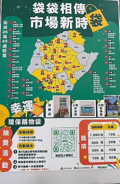 環保局長許仁澤說明,今年設置「袋袋相傳」的45處公有市場也舉辦抽獎活動,在5至7月期間,掃描站點QR-Code加入官方Line好友,提供基本資料並上傳個人在「袋袋相傳」站點取用循環袋的照片,即可參加抽獎資格,環保局在8月抽出130名得獎者,贈送獎品,最高可獲得面額1,000元便利商店禮物卡。