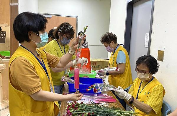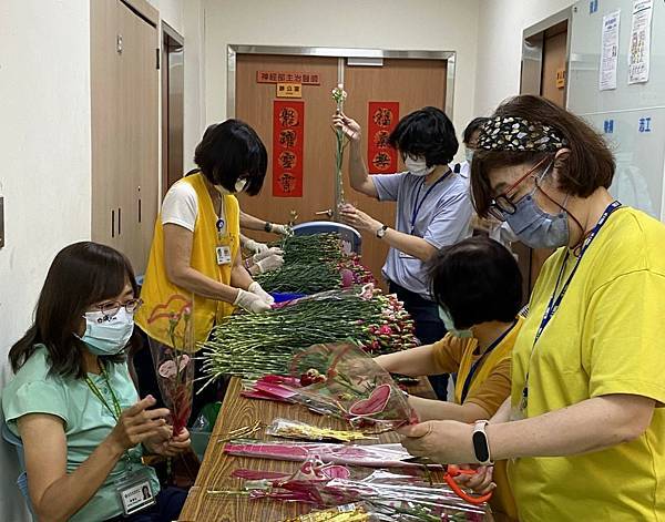 母親節送花祝福暨關懷活動已成為成大醫院志工團隊的傳統,今年分贈的大批康乃馨鮮花及材料,由「大安森林公園之友基金會」副執行長陳鴻楷先生,及本院資深志工林莊麗珠女士熱情贊助,再由熱心志工夥伴分工修剪及包裝。