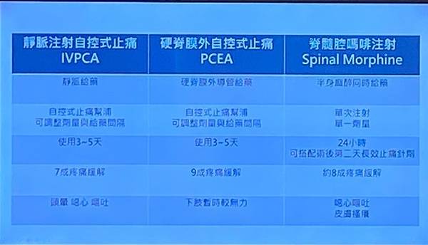 成大醫院麻醉部賈琬婷醫師分享,身為產房麻醉醫師,最常聽到準媽媽問:「醫師,請問哪一種止痛方式最適合我呢?」「這些止痛方式有什麼差異呢?」「我非常怕痛,可以全部麻醉藥同時用嗎?」,針對剖腹產後止痛,常使用的有下列這些方式: