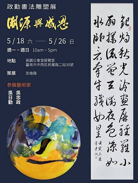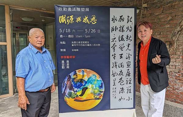 【柿子日報記者李玲/台南報導】吳政忠與吳日勤藝術家於5月18(六)至5月26(日)假吳園藝文中心公會堂展覽室舉辦「溯源與感恩 政勤書法雕塑展」。