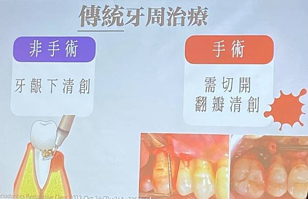 傳統牙周治療流程,包含非手術性治療和牙周翻瓣手術。第一階段非手術性治療是利用洗牙機和牙周刮刀,進行齒齦下牙根面整平。針對破壞中等程度以上的牙周炎,則需要進入到第二階段牙周翻瓣手術。然而患者可能因為恐懼手術不敢就醫、未達到手術性治療的標準或患有複雜性系統疾病等,導致牙周病未能控制,使問題日益嚴重,形成惡性循環。