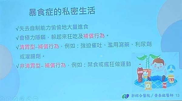 暴食症好發於青少年的飲食失調疾病,通常與受到社會風氣及對身體形象的錯誤認知、缺乏自信相關,先是不恰當的節食變成無法控制自己的進食行為,病患能吃超量的食物,暴食症患者,會極度關心身材和體重、以此來獲得自我評價。所以他們在瘋狂進食後,會以催吐、灌腸或大量運動等補償行為來防止體重增加,所以暴食症的個案很少有體重過重的問題。但是暴食患者的補償行為對身體的生理機能有很大的影響,如:因自行催吐或濫用瀉劑產生嚴重胃腸道問題等等。