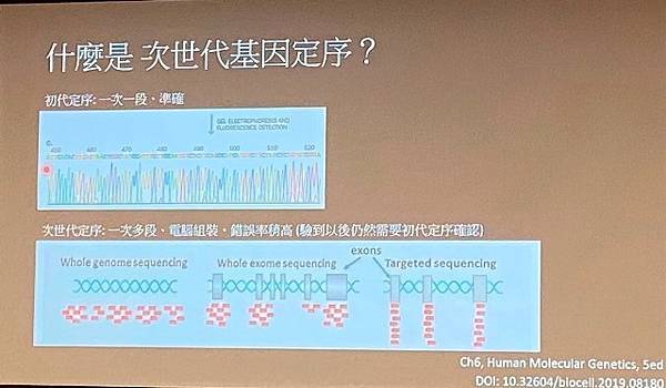 什麼是次世代基因定序?成大醫院神經部暨基因醫學部林伯昱醫師說明,傳統的初代基因定序一次只能定出一個片段的DNA序列,相較之下,次世代基因定序是將DNA分子分割成很多片段,然後同時進行很多個片段的定序,產生大量的基因片段序列數據,再由電腦計算進行組合,產生完整的基因序列。次世代基因定序的好處,是一次可以看很多的基因,而缺點則是定序的錯誤率比初代定序要高,因此次世代定序的檢驗結果,需要用初代定序再次確認,才不會造成臨床誤判。