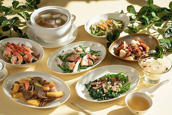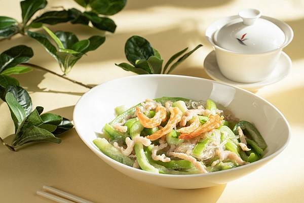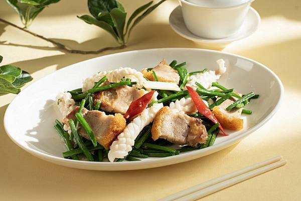 「玉簪鳳尾蝦」顧名思義是一道極費工的蝦球作法,去殼的新鮮白蝦串上蘆筍或廣東芥藍,造型類似古代髮簪,清炒保留原始食材的鮮脆爽口。「金勾銀絲脆瓜柳」,使用口感爽脆的澎湖絲瓜,配上金勾蝦、蛤蜊、肉絲一起拌炒出鮮甜,加入冬粉吸附飽飽的湯汁,是一道非常開胃的佳餚。「廣東芥藍鯪魚酥」鯪魚是香港家庭中常吃的魚種,炸得酥香、配上廣東芥藍一起炒,形成了鮮明的口感對比。整體味道清新、鮮美,是一道非常受歡迎的廣東特色菜。「韭菜花燒肉炒透抽」韭菜花夏天正當時,口感嫩脆,配上脆皮燒肉、Q彈的透抽,加入蝦醬拌炒,鹹香下飯。