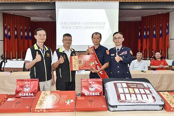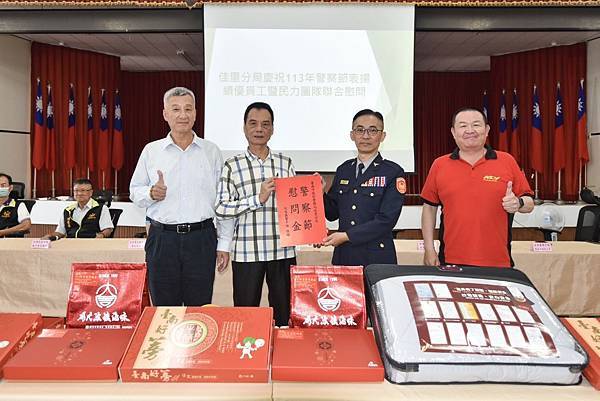 另佳里分局協勤民力團隊感念分局員警對轄區治安、交通及為民服務等工作之付出,特於今(12)日警察節前夕,由佳里警友辦事處周文雄主任親贈滷味及蛋糕禮盒、佳里義警中隊中隊長蔡寶財親贈警察節慰問金2萬元、佳里民防中隊中隊長陳駿逸親贈績優員工警察節慰問品臺南好蒡禮盒、佳里民防中隊顧問吳松儒親贈績優員工警察節慰問品石墨烯寢飾組及佳里守望相助中隊副中隊長黃江漢親贈警察節慰問金2萬元,並率協勤民力幹部至分局聯合慰問,以鼓勵員警工作士氣,感謝同仁辛勞付出。