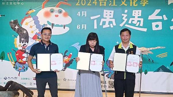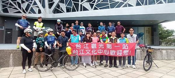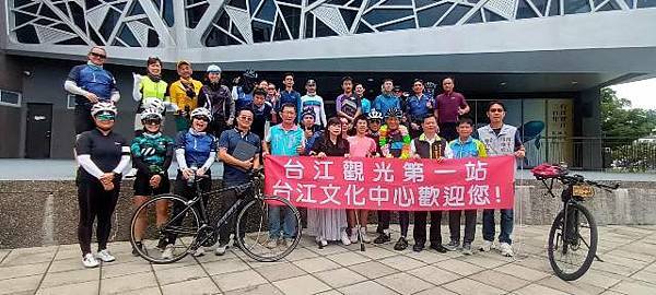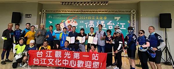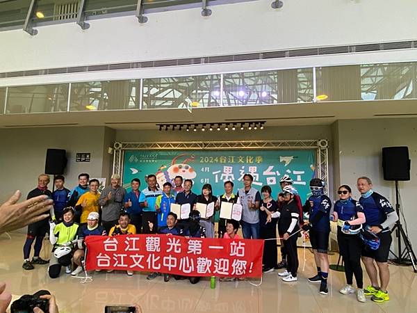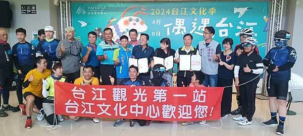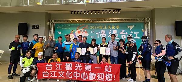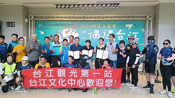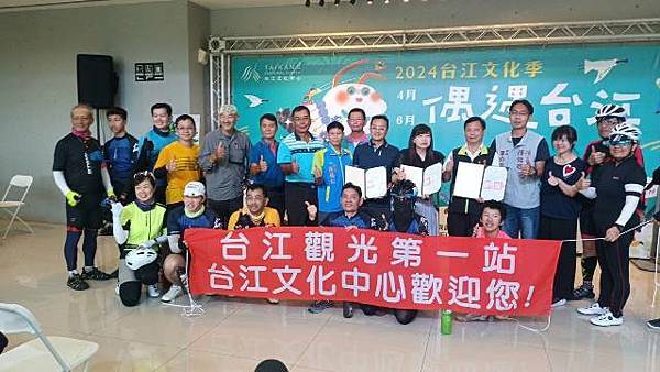 文化局方敏華專門委員也特別與安南區公所魏文貴區長、捷安特旅行社蔡嘉津協理交換合作備忘錄,並且為「台江觀光第一站」計畫的首發團捷安特旅行社環島自行車隊的代表,戴上迎賓花圈,希望各地旅客都能在台江,感受到台江人的熱情與活力,也期待未來能有更多旅行社一起來參與,整合觀光行銷,共同促進國內旅遊發展。