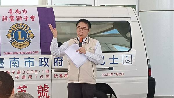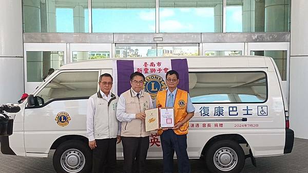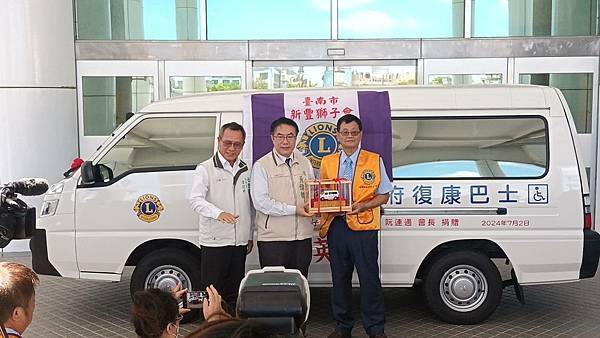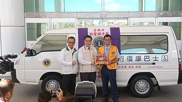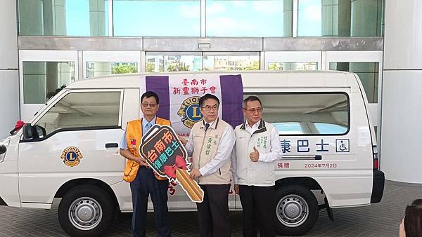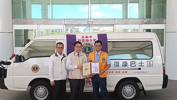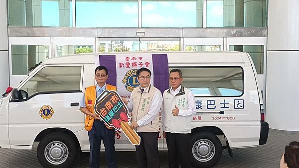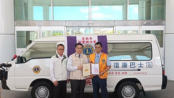 【柿子日報記者李玲/台南報導】為響應臺南市照顧弱勢優先的施政理念,新豐獅子會於111年及今(113)年3月各捐1輛復康巴士,本(7)月阮連通會長用實際行動支持身障朋友,再度捐贈1輛價值百萬元復康巴士,累計已捐贈3輛復康巴士。今(2)日下午社會局於永華市政中心2樓廣場舉辦捐贈儀式,黃偉哲市長親自出席代表接受,並回贈感謝狀給阮連通會長,2024-2025國際獅子會300E-1區曾澎英總監、新豐獅子會謝旭明會長和所有與會的獅友,以及林俊憲立委、周家韋議員、蔡宗豪議員服務處代表都到場參與見證。