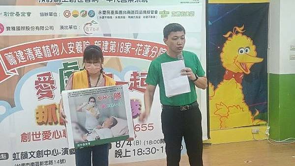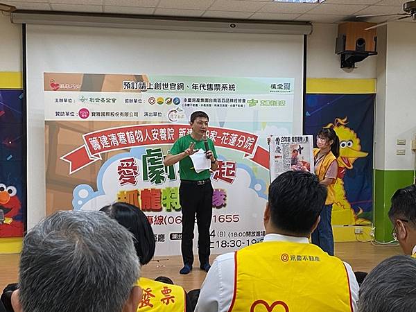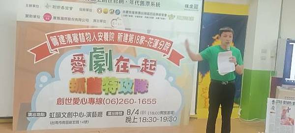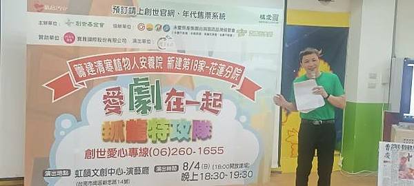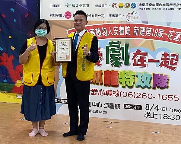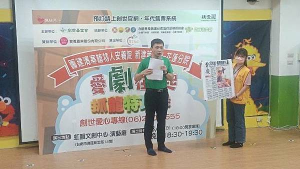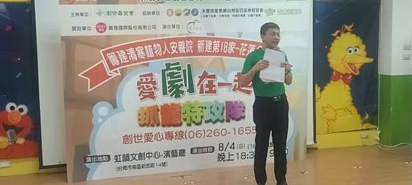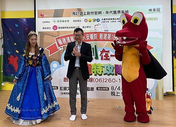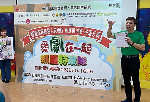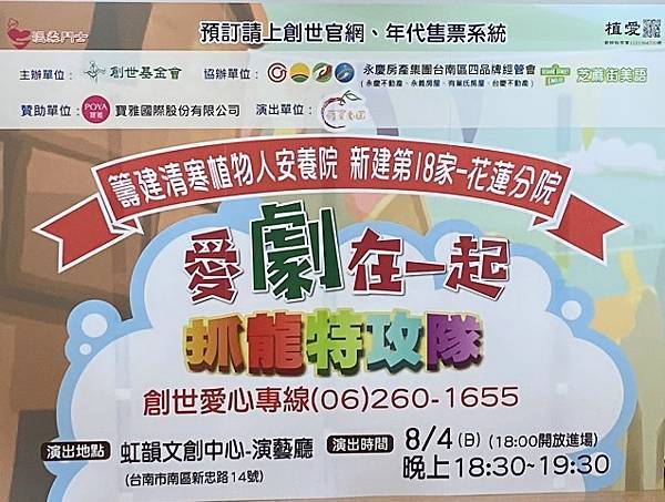 【柿子日報記者李玲/台南報導】創世基金會為籌建創世第18家安養院-花蓮分院與蘋果劇團攜手合作,推出全台十七場的「愛『劇』在一起」公益舞台劇,台南場在8/4(日)18:30於虹韻文創中心演藝廳盛大演出,歡迎大小朋友入場支持外。這次特別邀請創世植物人家屬,及在地弱勢團體至現場欣賞,一份愛心兩次公益。活動預計推廣800張票,目前認助尚不足一成,盼求社會大眾共襄盛舉。
