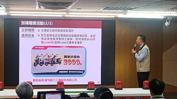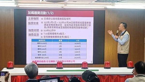 嘉義區監理所提醒市民朋友,本次民間企業亦大力贊助推廣機車駕訓政策,有宏佳騰動力科技股份有限公司贊助提供購車金與超商禮券抽獎活動、摩特動力工業股份有限公司贊助提供限量購車禮券,暑假期間來臺南參加機車駕訓物超所值,為了您及家人的駕駛安全,歡迎鼓勵身邊親朋好友共襄盛舉,降低交通事故發生。