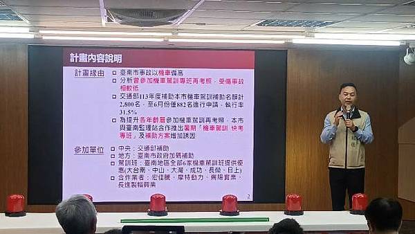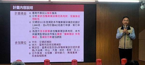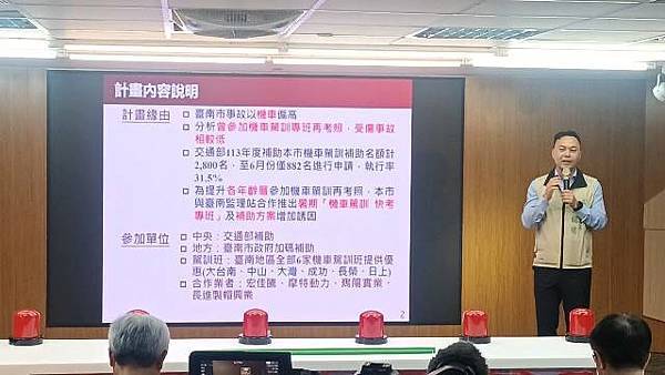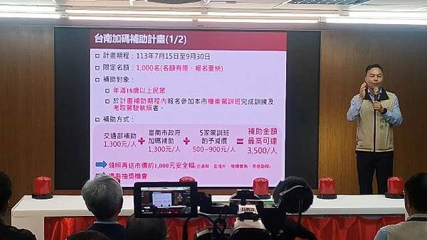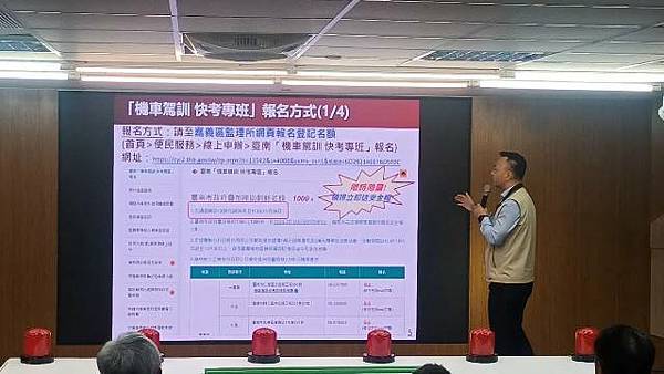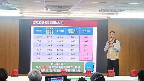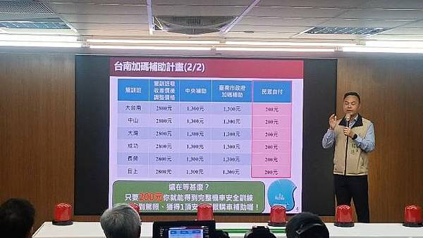 嘉義區監理所所長黃萬益表示,公路局今(113)年度持續辦理普通重型機車駕訓補助計畫,全國補助4萬個名額,每人補助訓練費用1,300元,補助期限至11月30日止,即日起至9月30日報名臺南地區機車駕訓班並考取駕照者,由臺南市政府額外疊加補助費用1,300元,中央與地方政府合計補助費用2,600元,另外臺南地區6家機車駕訓班基於企業責任自行吸收成本,民眾僅須負擔200元訓練費用即可獲得完整、正規專業的安全駕駛課程,並學習正確的機車駕駛技術及防禦駕駛觀念。