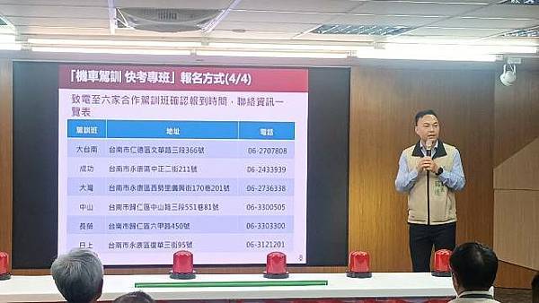 臺南監理站站長蔡娟娟指出,經統計截至112年參加機車駕訓學員較未參與訓練者,違規風險降低59%、肇事風險降低36%,顯見機車駕駛訓練對於降低交通事故防制成效良好。目前台南轄區內6家機車駕訓班均有開設快考專班,報名參訓後一週內即可領取機車駕照,分別為大台南駕訓班、成功駕訓班、大灣駕訓班、中山駕訓班、長榮駕訓班及日上駕訓班,本次補助資格民眾須至嘉義區監理所網站(https://cyi2.thb.gov.tw)-便民服務-線上申辦-臺南「機車駕訓 快考專班」報名登記名額,名額有限,報名要快!