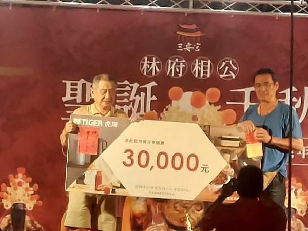 【柿子日報記者李玲/台南報導】台南市北門區三寮灣「三安宮」,昨天舉辦林府相公聖誕千秋大廟會,有宋江陣及東方藝術團表演,還有文化藝術季活動,主委林裕源還提供3萬元現金作為最大獎的摸彩金,以及近200份摸彩品,鑼鼓喧天,場面盛大熱鬧。