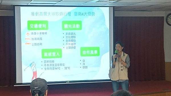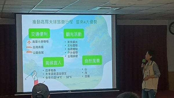 觀光旅遊局林國華局長表示,觀旅局的運動觀光遊程推廣計畫,著重跨域資源整合,串聯旅行業者、旅宿業者及其他觀光產業業者共同推廣。本計畫也以國際觀光客為目標,國際觀光客特別是韓國客群偏好於冬季(每年12月到3月)赴南國打球,臺南擁有宜人的氣候,四季如春,使得高爾夫運動全年皆適宜,讓各國球友無論何時來到臺南,都能享受悠閒的擊球時光。