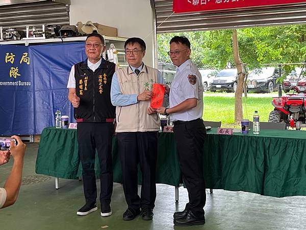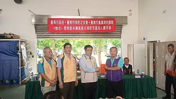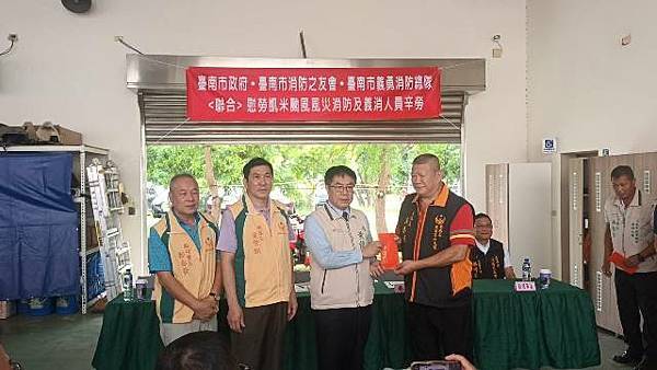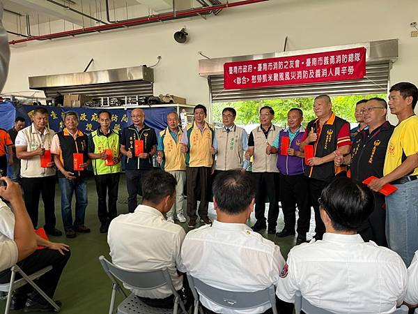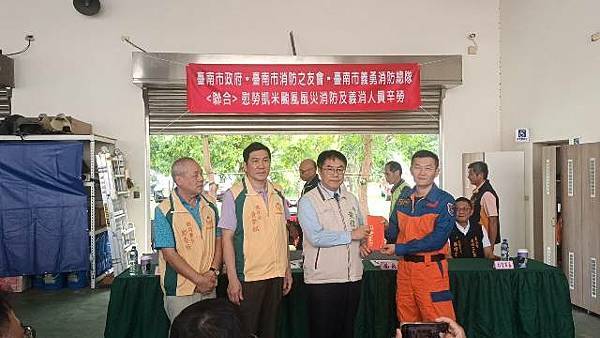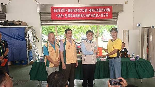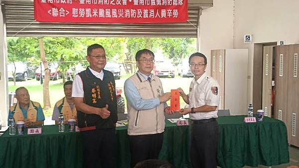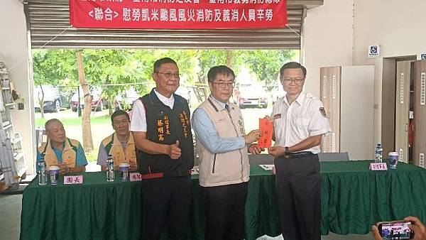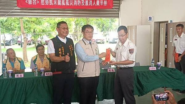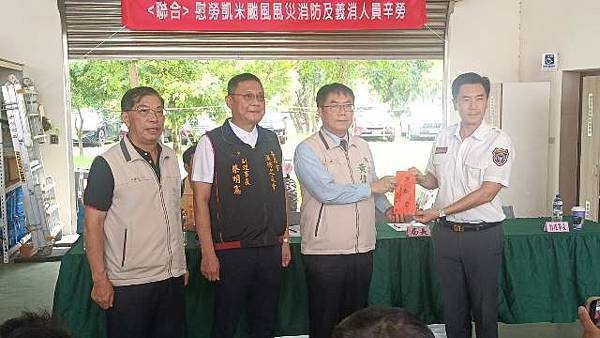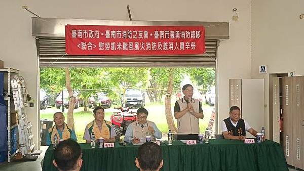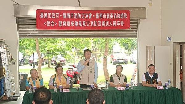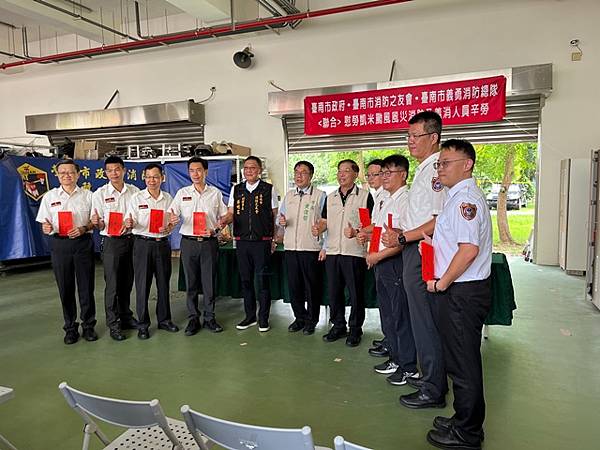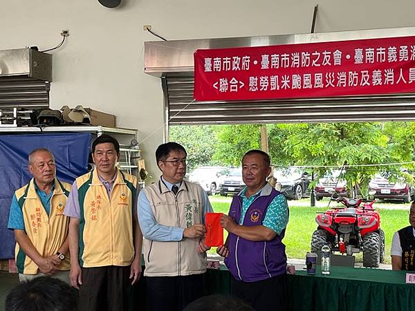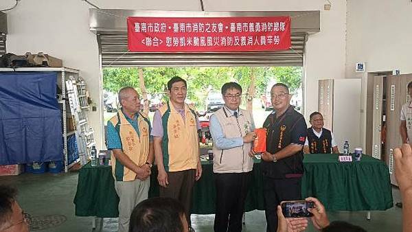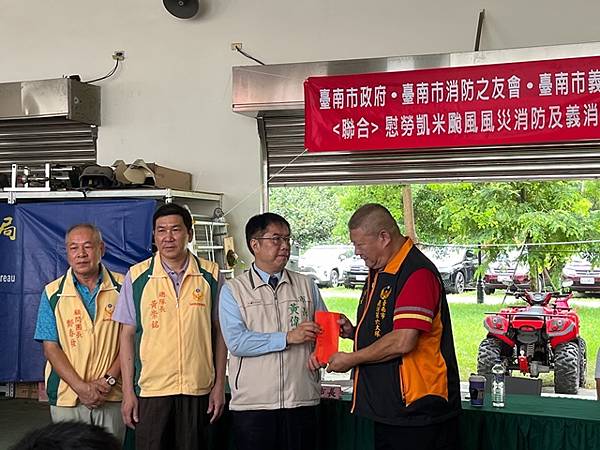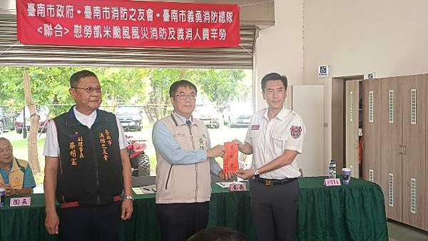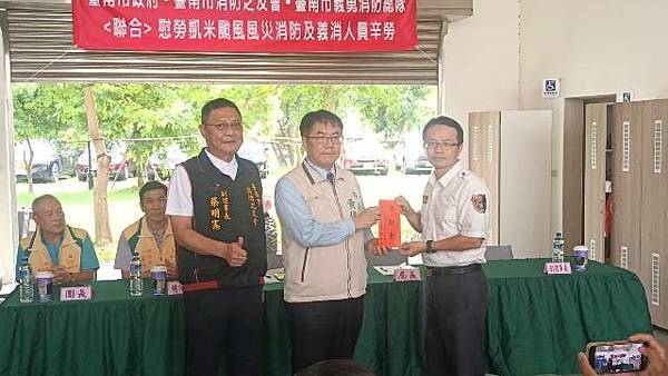 【柿子日報記者李玲/台南報導】凱米颱風重創台南市,導致多個行政區大淹水,消防人員自7月24日起即全力投入救災工作,為確保市民安全,付出了極大的努力,此次凱米颱風應變中心受理3420件災害案件,出動消防車輛共338車、消防人員683人,一共救出受困災民504位。為表彰他們的辛勞,市長黃偉哲在消防局長李明峯陪同下,率義消總隊長黃崇銘及消友會副理事長蔡明憲等一行,於29日上午9時30分親自前往消防局第五大隊部,向各參與救災的消防及義消團隊一一頒贈獎勵金,表示慰勉之意。
