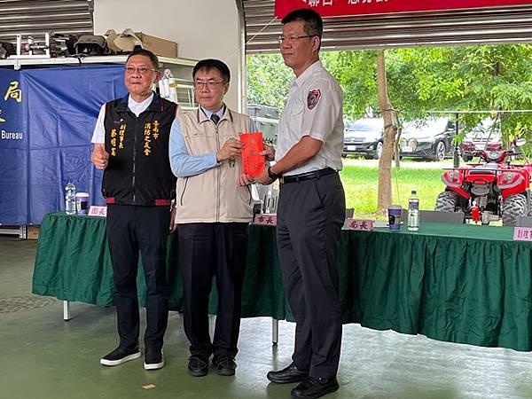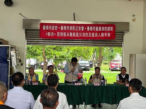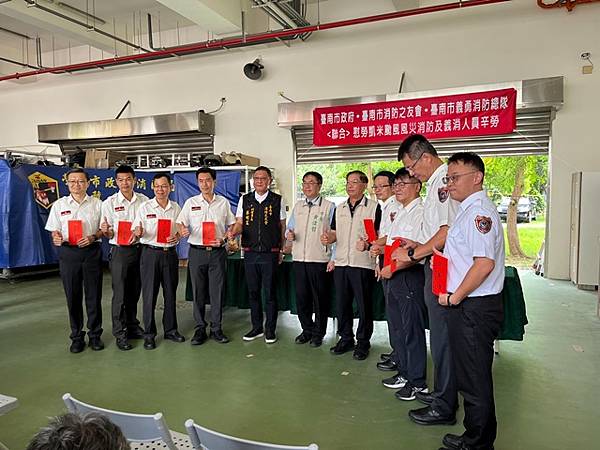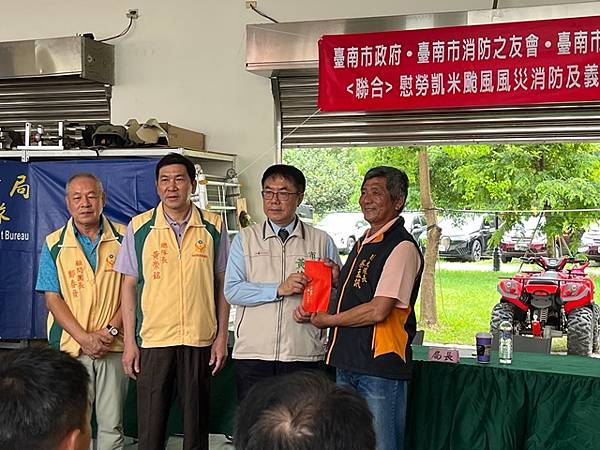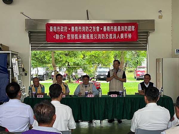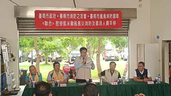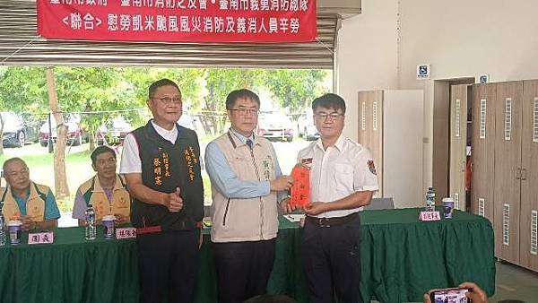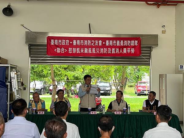 台南市 市長黃偉哲致詞表示:首先讚揚消防局李局長所率領的消防救災團隊,無論是消防或義消人員,每個人水裡來火裡去,不畏艱難奮力救災,所有表現真是可圈可點。另外也要感謝黃總隊長所帶領的義勇消防總隊及消防之友會,由於你們的鼎力支持讓消防救災團隊無後顧之憂。此次由於凱米颱風襲台帶來致災性降雨影響,造成八掌溪潰堤,導致後壁區與鹽水區一帶發生淹水災情,而消防救災團隊在李局長的專業領導之下,消防與義消合作無間、奮力不懈為保護市民大眾生命財產而努力,終將災害損失程度降至最低。