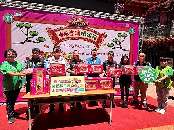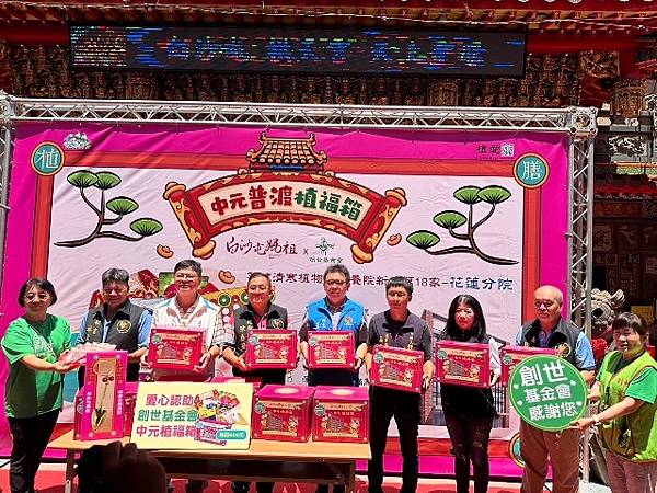 上午11點白沙屯拱天宮總幹事陳春發,於拱天宮率領團拜請示媽祖,創世也獻上超大金鏟子請媽祖加持,祈願順利籌建花蓮植物人安養院,幫助弱勢家庭走出困境。植福箱外型討喜,Q版媽祖加上亮眼的粉色外盒,內含7種熱銷零食餅乾,及一支白沙屯媽祖加持的金鏟子,讓今年普渡不僅有媽祖保佑,大方豐富又能做公益獻愛心,一舉多得。邀請企業團體、社會民眾認助,一同行善積福,為植物人及其家庭帶來更多希望與支持。拱天宮總幹事表示:「媽祖慈悲為懷,一直以來都在保佑我們的信眾,這次希望能夠通過大家的善行,為更多需要幫助的植物人及其家庭帶來福祉。」