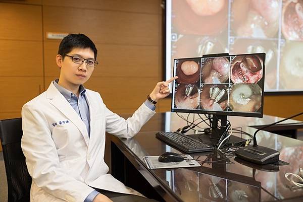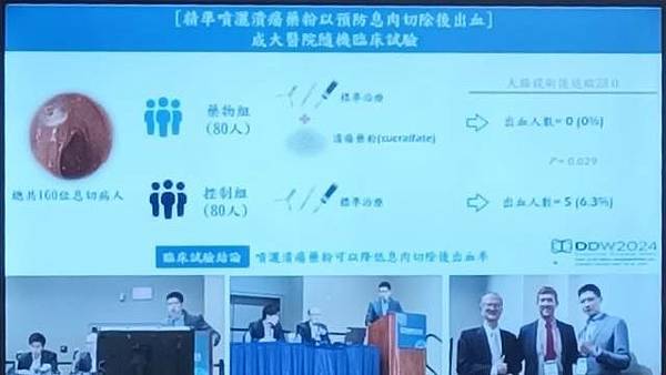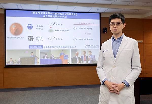 姜學謙醫師說明,糞便潛血檢查結果為異常(陽性)時,需進一步接受大腸鏡檢查。大腸鏡檢查中若發現息肉,醫師會直接切除並安排定期大腸鏡檢查追蹤。大腸息肉切除有2%的出血機率,除了使用預防性的止血夾,成大醫院團隊會評估患者狀況,提供林錫璋教授團隊研發的藥物噴灑裝置搭配潰瘍藥粉(sucralfate),能進一步降低出血風險。此研究成果由姜學謙醫師於2024年的美國消化疾病年會(Digestive Disease Week)發表。