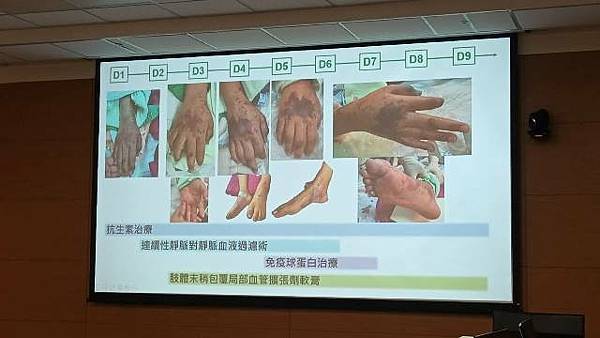 檢驗結果顯示,女童感染了惡名昭彰的食人菌,即「侵襲性A型鏈球菌」。女童還出現的罕見四肢猛爆性紫斑症(Purpura Fulminans),醫療團隊創新使用局部血管擴張劑處理,改善四肢血流狀況。照護女童的過程結合了小兒科重症團隊、小兒感染科、小兒腎臟科、小兒胸腔外科,和檢驗、護理、復健及兒童心理專業的緊密合作,細心提供完善照顧,住院六週後女童順利康復,且無後遺症地出院。