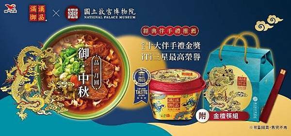 滿漢御品不僅在國際發光,對於台灣消費高端市場持續耕耘,在話題性上以故宮聯名取得《網路溫度計DailyView》透過《KEYPO大數據關鍵引擎》輿情分析系統調查出的「熱門聯名泡麵精選TOP 5」,近期仍秉持一貫限定款限量的銷售珍稀性,近期因應中秋佳節推出台灣「中秋版限量禮盒」,限定版禮盒設計首次採用湖水綠為底色,象徵明亮寧靜,展現團圓佳節-月圓及尊榮圖騰-龍的意象,跳脫中秋版禮盒刻板用色,打造精品伴手禮由外到內的視覺與味覺尊榮犒賞。
