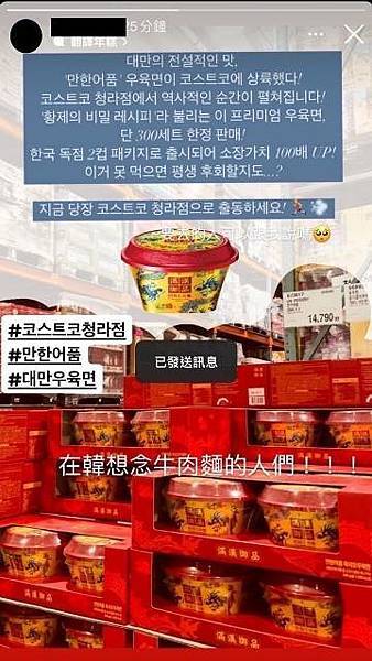 日前在網路上可以看到韓國網友以及住韓的台灣網友在臉書社團和instagram分享在韓國好市多購買滿漢御品的照片,「好精緻好高級的泡麵」、「終於可以在韓國吃到台灣味的牛肉麵了!」、「看到家鄉味好開心」。