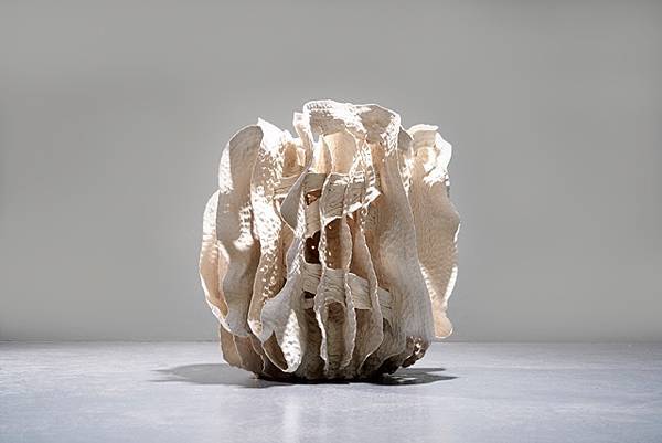 2024福岡藝術博覽會上,藝術家徐永旭與徐嘒壎的作品共同探索了時間和光影的交織。徐永旭的陶土作品如〈2020-12〉和〈2024-13〉,通過極薄的邊緣和複雜的結構,展示出時間的“孔隙”。他的創作過程猶如與陶土的對話,從中表達出對材質的深刻理解和情感共鳴,每個皺褶和紋理中似乎都藏著光陰的故事。