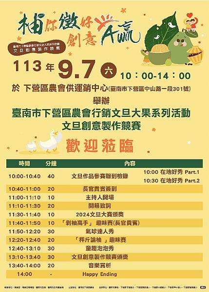 下營區農會將於9月7日(六)上午10:00於下營區農會超市後方藝文展演場,辦理「下營區農會行銷文旦大果系列活動-文旦創意競賽暨頒獎典禮」,同時有柚香秋意濃趣味競賽、在地好秀演出,邀請現場親子來農會參與剝文旦皮,在趣味中品嘗優質下營文旦柚,並於下營區農會超市下營店、中營店、農產品展售館、營農加油站四個營業點,辦理文旦大果行銷活動,當日起憑消費發票就贈送一顆文旦,數量有限,送完為止。