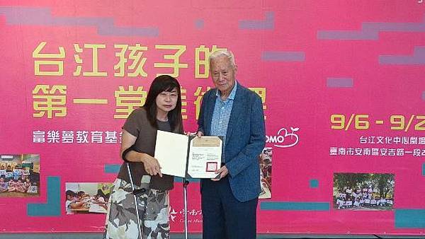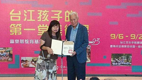文化局現場特別準備了感謝狀,頒發給富樂夢教育基金會,感謝基金會沈坤照董事長慷慨解囊,支持我們安南區的藝文推廣活動分享教育成果。這次參與計畫的安南區在地幼兒園,包括康橋幼兒園、仁仁森林幼兒園、愛因斯坦資優幼兒園三所學校近百位師生也一起到場,小朋友看到自己的作品展出,開心又有成就感,紛紛合影留念。