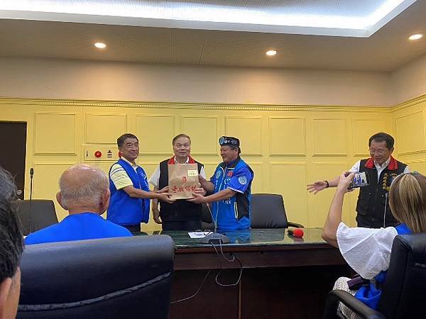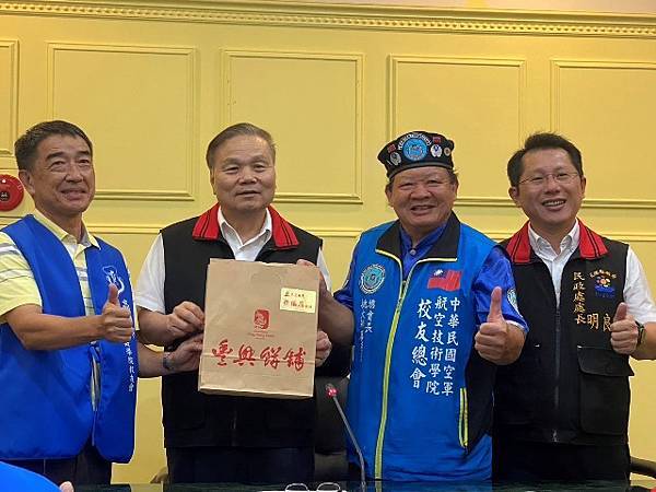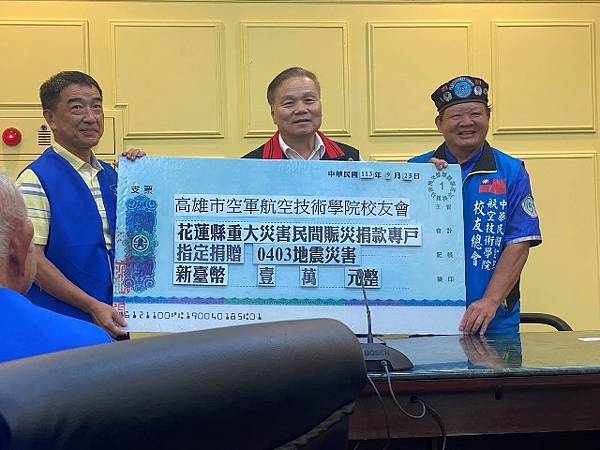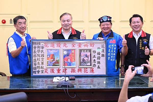 空軍航技校友會率先組團前來,給災區溫暖,無限感謝,盼中央儘速修復道路,惟有闢建修復快速安全的路,才是花蓮最迫切需要,縣府持續發展觀光,創舉要辦兩夜跨年,ㄧ定要到花蓮來跨年。廖總會長贈送著作韓詩三百首、韓詩大選、罷韓詩三本合輯,並裱框「花蓮優先 全臺共好」下聯「災後重建 振興花蓮」贈送縣府,勉為花蓮鼓勵,盼帶動遊客信心,盼國人組團旅遊,重返花蓮榮景。