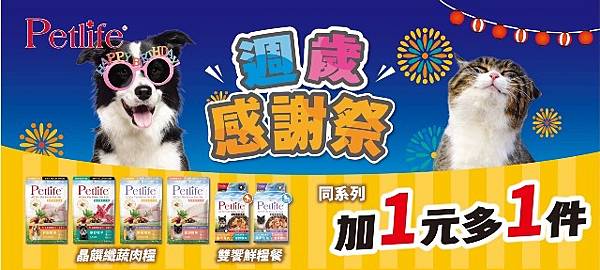 統一旗下精品寵物食品Petlife,自2023年10月上市,運用糙米、燕麥取代傳統黃豆、玉米、小麥,以低敏優穀乾糧為基底,加入食品級美味配料,為毛孩提供最安心的美味,上市以來即席捲各大寵物店與7-11等通路,在許多門市都佔據相當大的排面,截至今年9月已售出超過60,000包產品。深受毛孩與家長喜愛的Petlife,現在上市滿週歲啦!特別再祭出加1元多1件的全面優惠,要回饋所有支持Petlife的消費者,幫助毛孩爸媽們大省荷包!